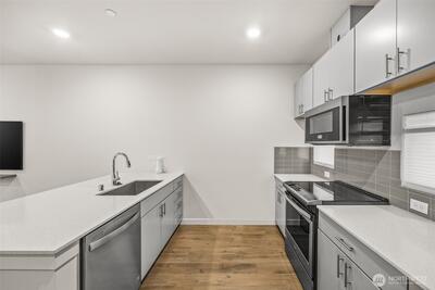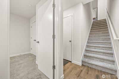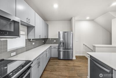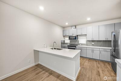 Beautifully maintained 3 bed 2 bath townhome, minutes to freeway, downtown & so much more! Modern finishes throughout this end unit home are sure to impress. Lower level features 1 bed & deep 1 car garage access. Main level w/open kitchen/dining/living room, perfect for entertaining. Sleek lines in the kitchen, w/quartz counters, tile backsplash & stainless appliances. Plank vinyl flooring throughout main floor. Slider door to balcony. Upstairs has a spacious bedroom & full bath. Primary bedroom w/large closet & ensuite bath w/dual sinks & tile shower. Washer/Dryer in hall. Mini-split heat pump for efficient heat & A/C. Storage space in garage. Minutes to Beacon hill restaurants & shops. 15 min to downtown. No Special Assessment. Come see!