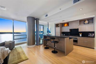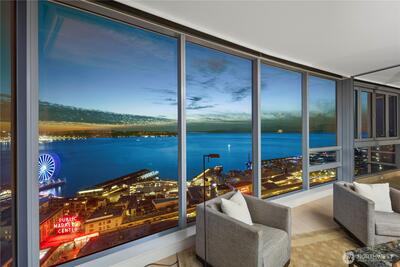 Unobstructed views while perched high above Seattle’s iconic waterfront, this 19th-floor residence captures sweeping views of Eliott Bay, Pike Place Market, Mt. Rainier to the South & the majestic Olympic Mountains. Floor-to-ceiling windows bathe the home in natural light, while the open-concept design blends sophistication with comfort. The sleek chef’s kitchen, spa-inspired bath, & refined finishes throughout create an atmosphere of timeless luxury. Enjoy the exclusivity of full-service concierge living with access to 3 Rooftop terraces, BBQ, gym, yoga, boardroom, & sky lounge. While being steps away from restaurants, stadiums, arts, retail, light rail, & everything Seattle has to offer.