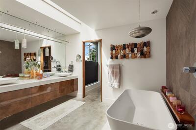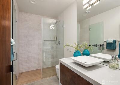 Rare culmination of modern & luxury artfully executed with custom details throughout. Floor to ceiling windows capture lake, city & mountain views while flooding the interior with natural light. Generous great room wraps a two-story atrium with tropical plants & bubbling fountain, integrating the sights & sounds of nature. 5 ensuite bedrooms, including a main floor guest & separate home office. Lower-level suite w/private entry offers MIL potential. Smart home features enable remote automation. Private yard with tranquil koi pond. Gorgeous landscaping surrounds the home with a rainbow of perennial color. Exceptional Lk WA schools & just steps to waterfront parks, shops & dining. Unsurpassed quality & design near desirable downtown Kirkland!