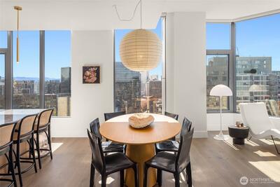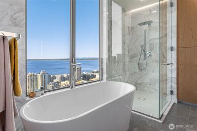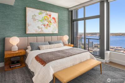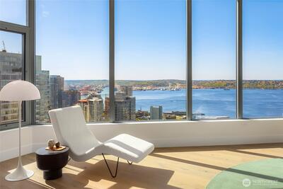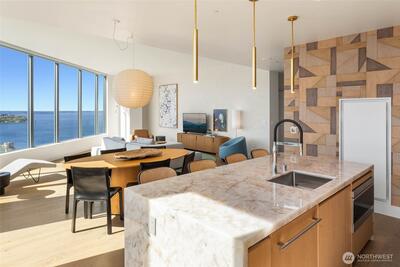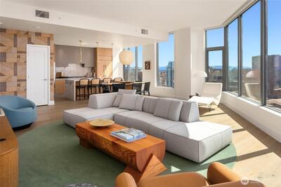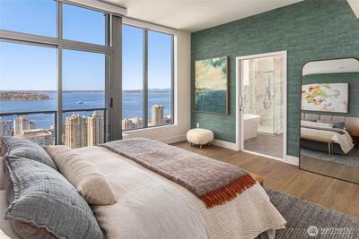 Spire’s Penthouse Collection is here! A stunning SW corner 3 bed combines incredible layout with wraparound views of Elliott Bay, Puget Sound, downtown, and the Olympics that make this home a standout. You will be amazed at the interiors that include Sub-Zero/Wolf appliances, kitchen island with waterfall counters, Jr Primary bed/bath, spa-like primary bath with free-standing tub w/Sound views, two parking and storage locker! Amenities include 24/7 concierge, top floor fitness center, pet run, 40th floor clubroom, dining, terraces, co-working space, theater, movement studio + more. Don't forget about the automated parking providing more luxury to your experience. Spire offers nothing but the best! Buyer must register broker on first visit.