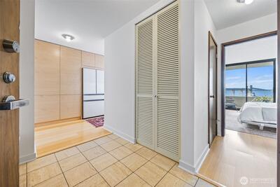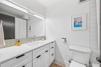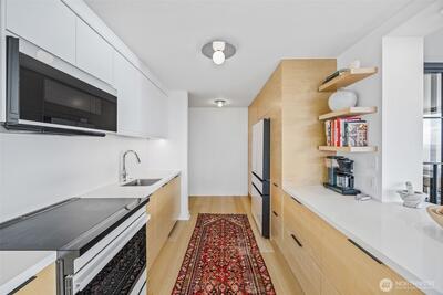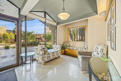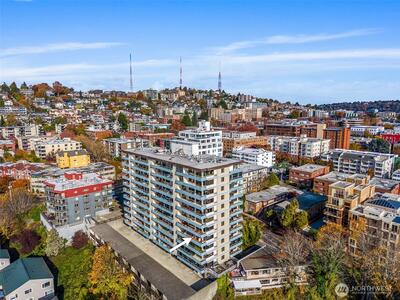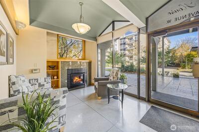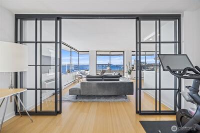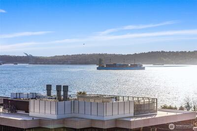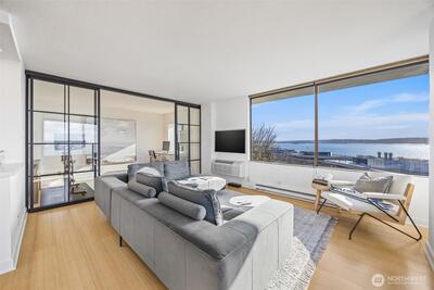 Experience the ultimate in urban sophistication from this stunning Queen Anne condo with expansive deck, where panoramic southern & westerly views of Mt. Rainier, Elliott Bay, Olympic Mountains, & ever-moving WA State Ferries create a breathtaking daily backdrop. Every detail reflects thoughtful design & elevated taste—including Kelly Wearstler & Herman Miller Nelson lighting illuminating the space in sculptural elegance. Sleek kitchen dazzles w/ pure white quartz counters, custom modern twig maple cabinet fronts & custom-built steel & glass partition wall—an artful division of space enhancing flow. Nestled on quiet cul-de-sac, this mid-century modern unit offers designated parking & serene retreat in the city’s most vibrant neighborhood.