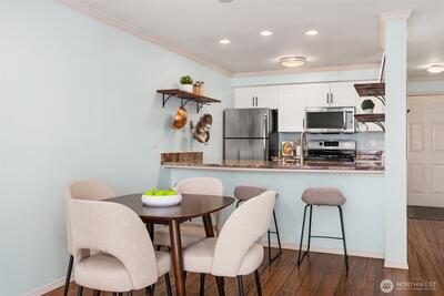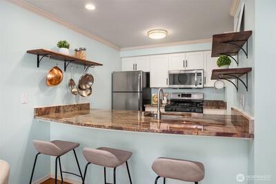 Super charming, updated top floor unit in lower Queen Anne. The city is at your fingertips…take in Storm or Kraken games, Bumbershoot, KEXP at Seattle Center or take a quick walk to downtown, the waterfront, and light rail. You’ll never run out of amazing shops and restaurants to try in this cultural hotspot. Practicalities and amenities abound including an assigned parking space in secure garage, storage space, and shared roof deck with sweeping views of the Space Needle, downtown, and Puget Sound. Spacious in unit laundry room with washer and dryer plus storage. Sweet private balcony to watch the sunrise, and a gas fireplace for cozy evenings in. Treat yourself at Nielsen’s Pastries, a Queen Anne institution, right downstairs.