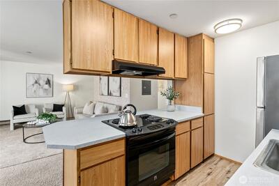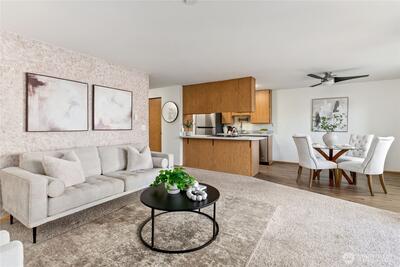 Updated top-floor condo offering natural light, privacy, and a functional layout. The open living area includes a dining nook and a private balcony overlooking the community. Kitchen features ample storage and a convenient breakfast bar. Two spacious bedrooms, including a primary with an attached bath and generous closet space. In-unit laundry and assigned parking included. Community amenities may include clubhouse, sport court, or common areas (buyer to verify). Close to shopping, schools, and transit access for easy commuting. HOA covers exterior maintenance, water, sewer, and common area care.