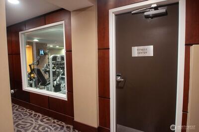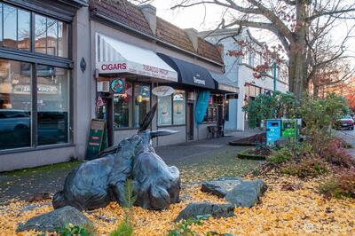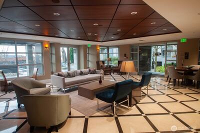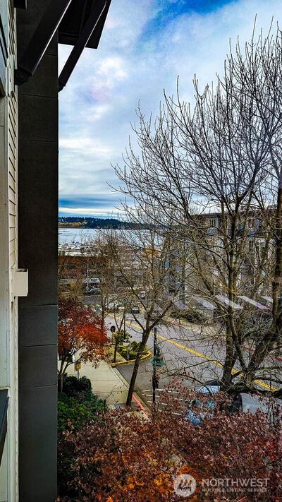 Picture yourself in this upscale downtown corner condo, just steps from shops, dining, beach, marina & employers such as Google. Generous kitchen w/ slab granite counters & breakfast bar overlooks light-filled Great Room with partial view of Lake Washington. Relax by the gas fireplace in winter or on the private balcony in warmer months. Primary suite has full ensuite bath and walk-in custom closet. Second bedroom/home office has fold-down bed. Another full bath & utility closet are off the hallway; marble tiling in both baths. Common amenities include fitness center, package room & patio with seasonal firepit. Unit has 2 adjacent spaces in secure garage. Dues include quake insurance and many utilities. New roof and elevator; well-run HOA!