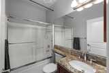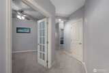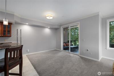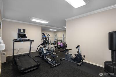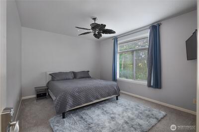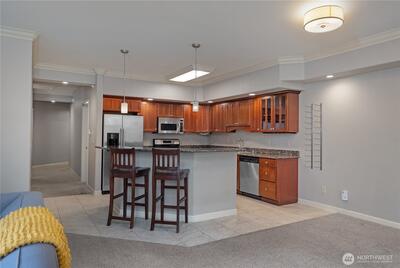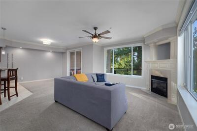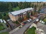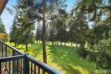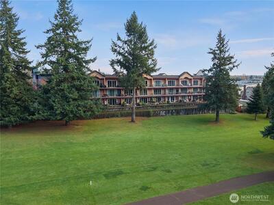 Spacious Golf Course Condo with great views! This quality built corner unit features an open concept kitchen, family rm, dining area & an island w/breakfast bar. These condos have dual walls to ensure quiet condo living & the heated radiant floors are great for a healthy living environment. Upgrades include granite counters, SS appliances, gas range, pendant lighting & trash compactor. Large deck overlooks the golf course. Primary bath w/soaking tub & vessel sinks leads to the large walk-in closet. All the closets have built-ins. 3rd room can be a den/office w/French doors or just use as 3rd bedroom. Well appointed gym has everything you need in the building to stay fit. Gated garage offers 2 parking spots & storage unit. Easy I-5 access.