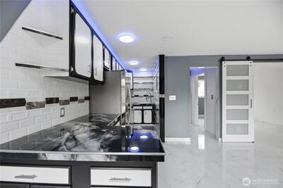 Over the top, light & bright, custom craftsman one bedroom, one bath top floor corner condo. Exquisite Carrera marble flooring. In-floor radiant heat. Every surface has been meticulously updated. The kitchen features marble counters, subway tile backsplash, stainless appliances, custom lighting including soffit lighting. Large living room with beautiful contrasting marble fireplace, new windows throughout. Primary suite with barn door access to living room to highlight the expansive space, in-suite washer/dryer, primary bath with custom chrome fixtures & extensive detailed tile. Deck off entry. One car reserved parking. Easy access to shops, parks, restaurants, freeways, bus line & light rail. Quaint complex, low HOA fees, no rental cap!