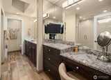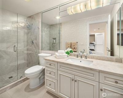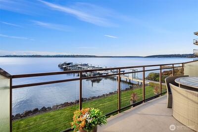 An exceptional boutique residence extensively remodeled within a gated building of just 9 homes. Step inside to sweeping, panoramic views of Lake Washington the Olympic Mountains, and the glittering Seattle skyline after dusk. The thoughtfully designed floor plan offers 2 bedrooms and 2.5 baths. A spacious primary suite with stunning luxurious bath featuring heated floors. Quality classic kitchen with French Baroque style cabinetry that never goes out of style. Hardwood flooring anchors the main living & dining spaces, while a generous balcony creates the perfect setting for outdoor entertaining. A deeded boat slip with new lift is included, along with 2 secure covered parking spaces and an additional uncovered space and dedicated storage.