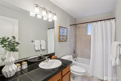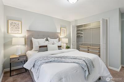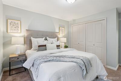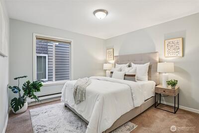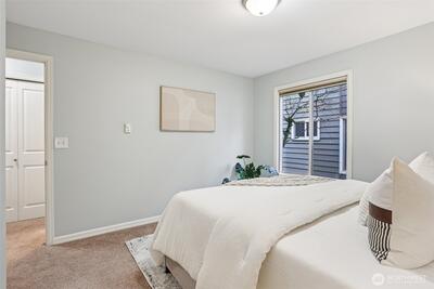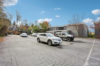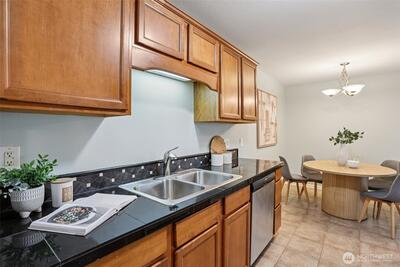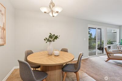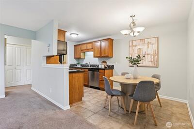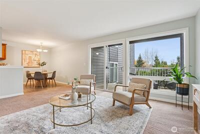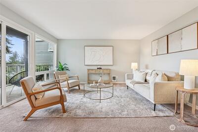 Cozy, charming Kirkland condo with tasteful updates throughout. Light-filled kitchen with stainless appliances, tile backsplash, and tiled counters opens to dining area. Neutral paint and flooring create a warm, inviting feel. Large slider fills the space with natural light and leads to a private deck boasting west-facing views of the Olympics and Lake Washington—perfect for relaxing day or night. Perks include in-unit washer/dryer, updated windows, newer carpet, parking space, extra storage, low dues, and a newer roof. Prime location close to downtown, Olympics and Lake Washington, Google, parks, trails, and transit. Pre-inspected. No rental cap.