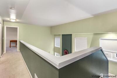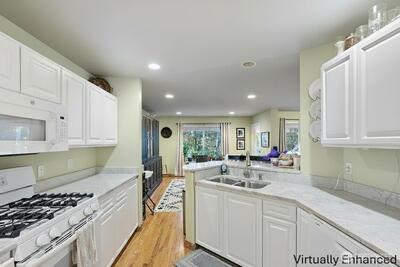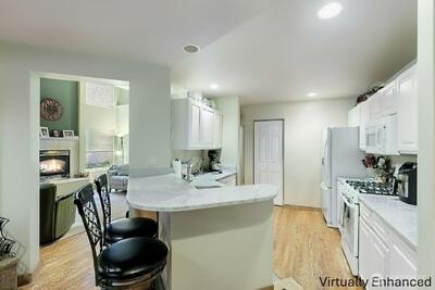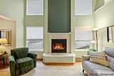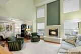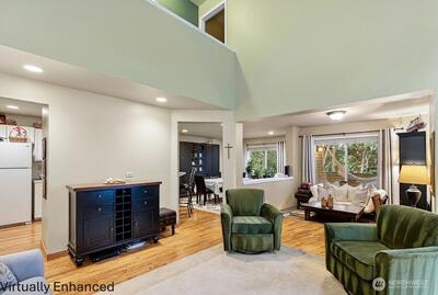 Bright and inviting home featuring soaring ceilings, abundant natural light, and a warm gas fireplace as the living room centerpiece. The open layout flows into a well-appointed kitchen with breakfast bar seating and ample cabinet space. Versatile dining and flex areas offer room for entertaining, work, or relaxation. Large windows overlook the surrounding greenery, creating a peaceful indoor-outdoor connection. Thoughtful updates and spacious rooms throughout make this home move-in ready and perfect for comfortable everyday living.