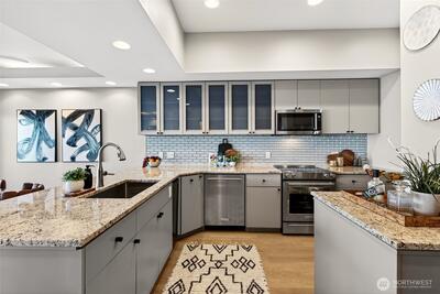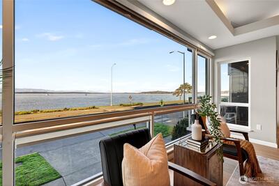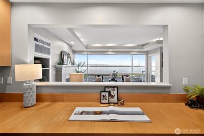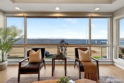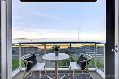 Welcome to this Beautiful 2 bed + office, 2 bath w/Floor-to-ceiling windows. Unobstructed views from the living, dining, kitchen & office of the Sound & Mountains. Enjoy watching ferries, whales, & beautiful sunsets w/no wires or buildings in sight. This home has high ceilings, open layout ideal for everyday living and entertaining. The remodeled kitchen has generous cabinetry, newer appliances, a spacious pantry, complemented by new floors, fresh interior paint, & updated bathrooms. In-unit A/C for comfort. The primary suite is designed for relaxation. A rare large laundry room w/storage. Storage, 2 sec parking spots, EV ready, & a well-managed HOA. Just steps to Alki Beach, dining, coffee shops, the water taxi. This is a true must see!