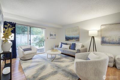A quite, very private and and well-appointed condo home in a community that prides itself on the natural beauty of surrounding nature, the conveniences of comfortable living and cohesiveness of community. This home looks out onto foliage thru sliders leading to a covered patio that invites you (and friends) to relax outside. New laminate plank flooring in the living room area lends an elegance to the home, and there is newer plush carpeting in the generous bedroom. The home has been freshly painted, including lovely gally kitchen. Close to Juanita Beach, shopping and restaurants. One deeded parking space near the building, and easy access to nearby freeways. End unit.