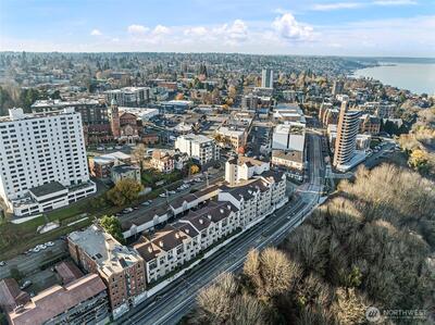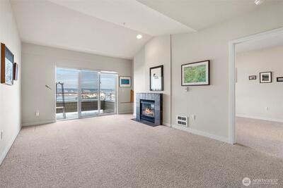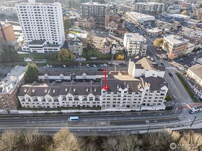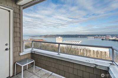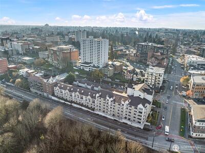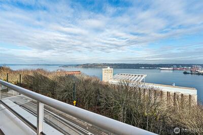 VIEWS VIEWS VIEWS from this top floor, end corner unit!! Big views of Mt. Rainier, the Cascades, Commencement Bay, and the Port of Tacoma. Light and bright in every room with TWO private balconies. Quiet and updated with beautiful flooring and fresh carpeting. Large primary bedroom with two generous closets and en suite bath. Second front bedroom with additional large closet space. Close proximity to the new light rail line, shopping, restaurants, and grocery in the Stadium District, Wright Park, and the downtown. Private parking in the underground garage with additional storage unit.