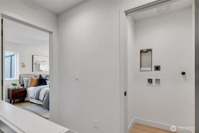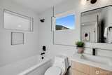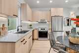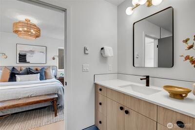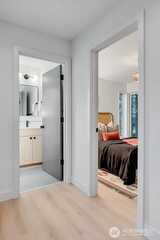Cedar siding warms the exterior of this architecturally crafted attached ADU, designed for flexibility & modern ease. The main living level is filled with natural light. Open dining & living spaces, and a kitchen anchored by stainless appliances & refined finishes—perfect for everyday living or entertaining. The top floor is devoted to the primary suite, a calm retreat with a lux walk-in shower & integrated laundry space. The entry level hosts a private bedroom with slider access to the outdoors. The adjacent full bath with soaking tub creates an ideal guest suite or home office. Thoughtful details, A/C, dedicated parking, and nearby Light Rail enhance daily convenience. A polished urban dwelling where design, light & livability converge.