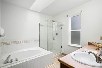 BACK ON THE MARKET 2,820 sqft. One of the biggest homes. Beautifully maintained in a desirable neighborhood, lovingly cared for by a longtime owner. Featuring premium-grade 50-year roofing and TWO primary bedrooms on the main level, each with an ensuite bath, this home offers exceptional flexibility. The expansive kitchen includes skylights for abundant natural light, ample storage, and space for hosting gatherings, along with stainless steel appliances throughout. Enjoy a welcoming living room, a grand fireplace and a dedicated dining area for entertaining. Step out to a deck off the kitchen overlooking a large, fully fenced yard with patio—perfect for relaxing or pets. A spacious bonus room offers endless possibilities as an office, media, or theater room.
