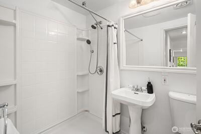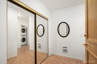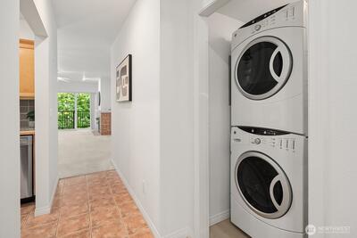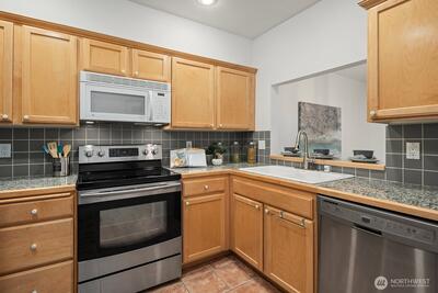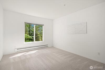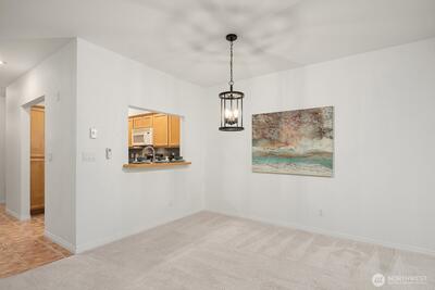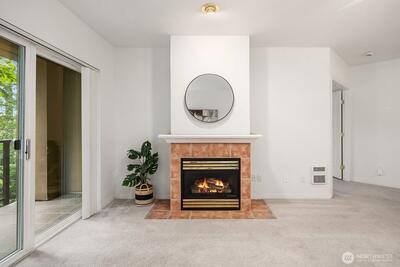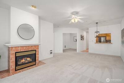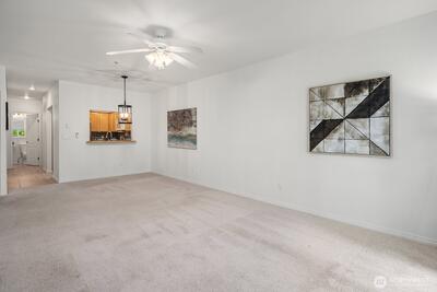 Effortless comfort awaits in this bright 1-bedroom + den, 1.75-bath condo within walking distance of The Village at Totem Lake. Sunlight fills the open living area and extends to a private deck, perfect for relaxing or entertaining. The kitchen features maple cabinetry, tiled entry, and ample storage. A spacious den offers flexibility for a home office, guest room, or reading nook. The primary suite includes dual closets and an ensuite bath. Enjoy everyday ease with 2 dedicated covered parking stalls, private storage, elevator access, and a heated driveway, all in a prime location near shopping, dining, and entertainment. No rental cap!
