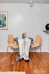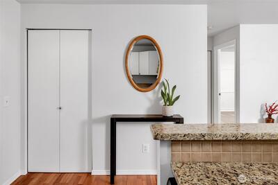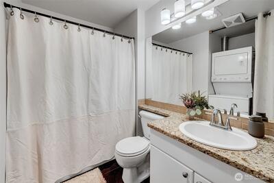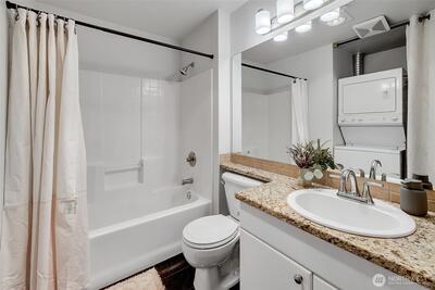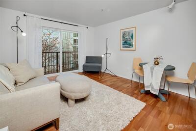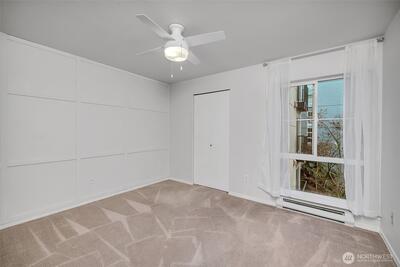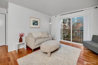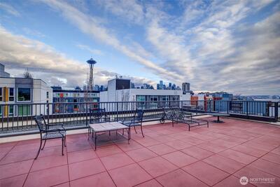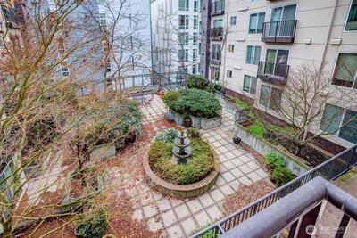 Overlooking a peaceful courtyard, this light filled condo is minutes to all of the events and culture at Seattle Center. Enjoy the birds in the trees and fountain view from your large windows with Juliet balcony. Stainless appliances and bedroom large enough for a king size bed. Your own in-home laundry and plenty of closet space. Entertain, BBQ or relax on the rooftop deck overlooking the Puget Sound, Space Needle and City views. Other amenities include: secure entry, private gym, study/workspace with fireplace, theater room, community kitchen + eating area and access to the quiet courtyard. Secure parking spot included. No rental cap. Immerse yourself in culture with access to Seattle's best events + nearby movie theater, cafes and bars.
