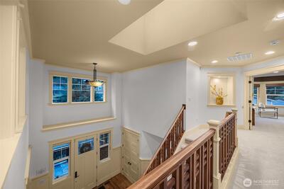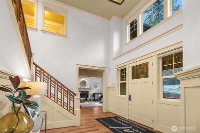 INVITING NEW PRICE to live in a luxury Bellevue estate near the lake. Offers reviewed on Tuesday 3/24th. Step into the grand entry of this home and be greeted by vaulted ceilings, wainscoting, custom trim, millwork, and two fireplaces anchoring elegant living spaces. This coveted Modern Craftsman estate is perched on a corner lot within an enclave of luxury homes. “Excellent” grade construction showcases incomparable materials and hardware—a home built in an era when they simply don’t make them like this anymore. Newly refinished hardwoods, brand-new carpet, new washer and dryer, and a new roof with transferable warranty provide lasting value. Peekaboo lake views from the serenity of the primary BR sitting area. The main level offers a flexible bedroom or den with private access to the wraparound porch. The chef’s kitchen features a Viking 6-burner range, double ovens, SS appliances, Moen fixtures, custom cabinetry with organizers, and two pantries including a butler’