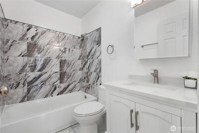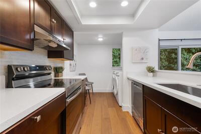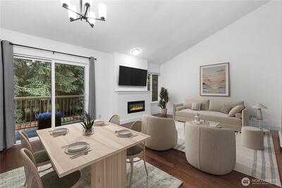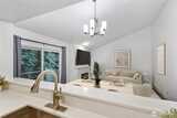 Sophisticated contemporary updates on top floor. Vaulted ceilings, light colors & smart floorplan. Chef’s kitchen features new custom cabinets & quartz counters, brand new appliances & new wa/dryer off kitchen. Great site lines to spacious family rm w/new fireplace. Dining area w/access to private deck w/nature views. Generous primary suite w/updated bath: tile accented shower room & double-size closet. Guest room w/adjacent full bath & new tile surround. Desirable spot w/Grassy area in front & privacy in back. Covered parking w/storage & ample guest parking for extra cars. Cmu pool, clubhouse & sports court. Nearby shopping, dining & trails. Kent Schools. No rental cap. No special assessments. Close to Airport, D/T Renton, Bellevue & more!