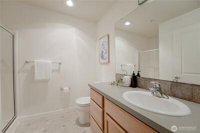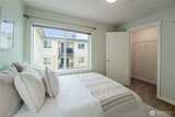 Top-floor, end-unit condo lives large with abundant natural light and west-facing windows that fill the space with warmth. The open kitchen with extensive cabinetry flows into a spacious living and dining area and a private deck for fresh air and relaxation. Featuring 2 bedrooms and 1.75 baths, the primary suite offers three closets and an en-suite; the second bedroom includes a walk-in closet. In-unit washer/dryer, elevator access with no stairs, and two secure parking spaces add everyday ease. Pet-friendly, well-managed building with strong reserves and no rental cap. Near groceries, parks, dining, I-5, and the future Pinehurst Light Rail Station (2026).