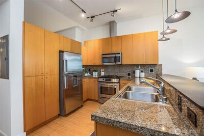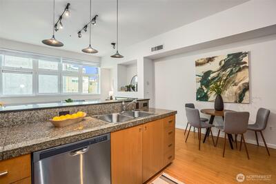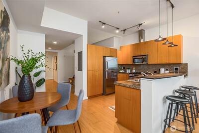 Light and bright open one bedroom at Tribeca Condominiums in lower Queen Anne. Extremely high ceilings and big windows create a voluminous feel in this open layout with views of the Space Needle. Spacious kitchen overlooks the living room with an eating bar and room for dining too, setting this condominium apart from others. Lots of storage and space for creative built-ins to customize the layout. Live above a grocery store, what could be more convenient? Ideal location near shops, services, sporting events and your favorite concerts. Enjoy outdoor soirees on the huge community rooftop view deck. Parking included! No rent cap and pet friendly! Investors take note; currently tenant occupied and tenant would love to stay.