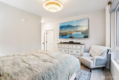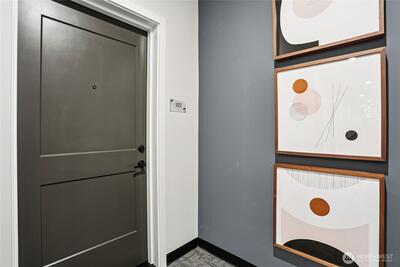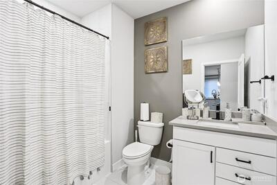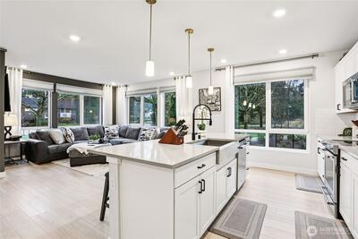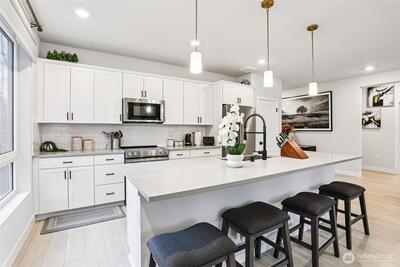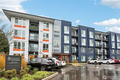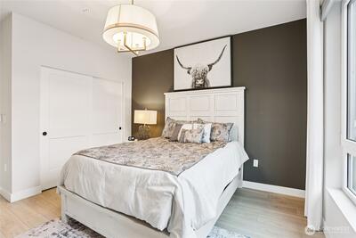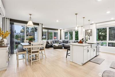 Experience bright, modern living in this corner ground-floor 2-bedroom, 1.75-bath unit in a convenient Shoreline location. Sunlight pours through large windows into open-concept living and dining areas, seamlessly flowing into a kitchen with quartz counters, a large island, and KitchenAid stainless steel appliances. The primary suite offers a walk-in closet and en-suite bath, while an additional office or flex space with French doors provides versatility. Enjoy a dedicated laundry room, one assigned garage space, secure building access, and easy reach to downtown, shopping, and dining.