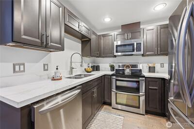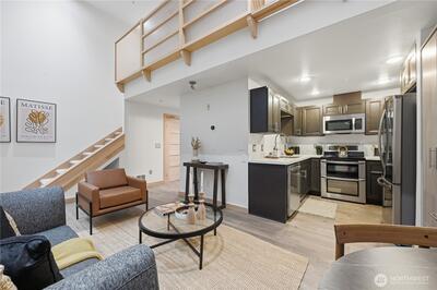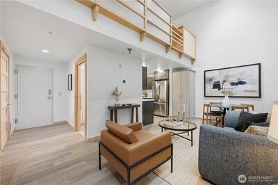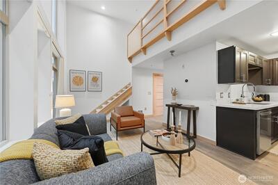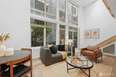 Home for the holidays! Attn 1st or 2nd home or investor buyers looking for the ideal condo w/restaurants, shopping, Macrina's Bakery just steps from your front door! Stunning & dramatic two-story loft style home w/walls of glass drenched in west facing natural light! Beautiful updates include a renovated kitchen w/new cabinetry & slab quartz countertops. Gorgeous wide plank wood flrs on main level & freshly painted. Sliders lead to patio for ultimate entertaining! Full bath, stack W/D, secure parking & storage too! Incredible rooftop deck views to enjoy the sunsets & city! Airbnb & pets okay too! Outstanding location - close to wtrfrnt, Pike Place Mkt, Sculpture Pk, Seattle Ctr, pub trans & more! Live in the heart of Belltown! Hurry!