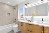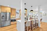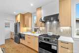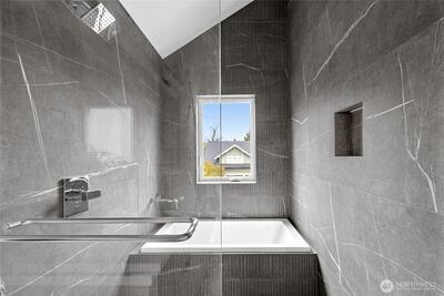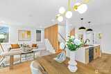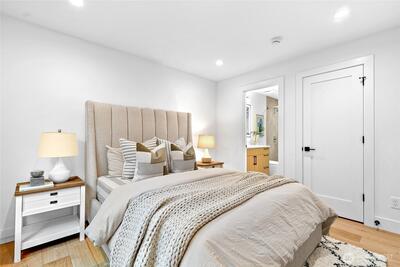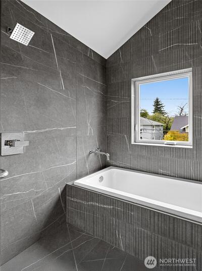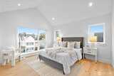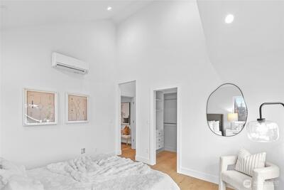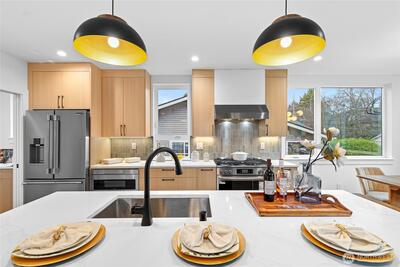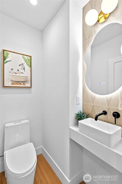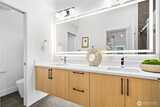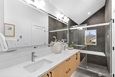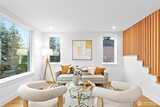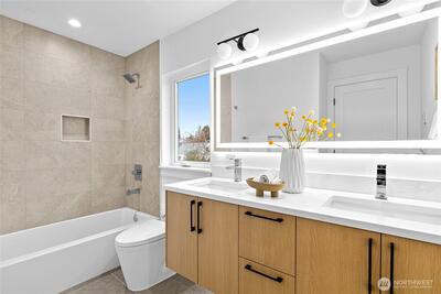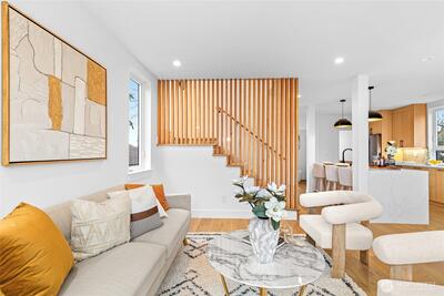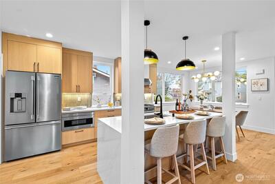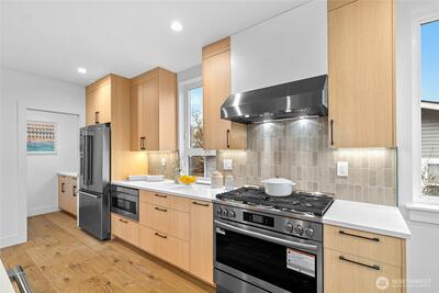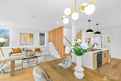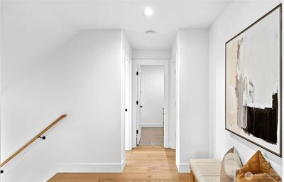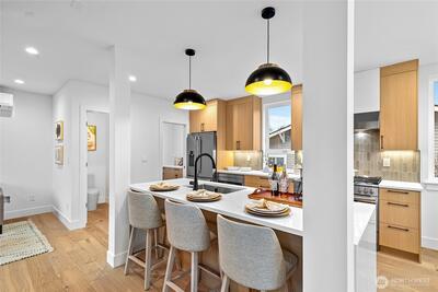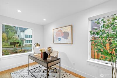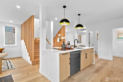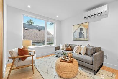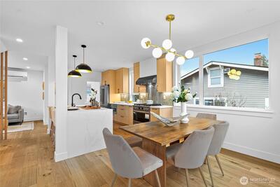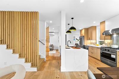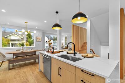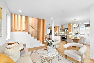 New 3-bed/3.5-bath Ballard home with exceptional street presence. Soaring ceilings and large windows bathe every room in natural light. Main level excels for entertaining with seamless flow between TWO distinct living rooms (or convert one to office), dining room, chef's kitchen with white oak cabinetry, gas range, custom hood, premium appliances plus dedicated prep kitchen. Top floor primary suite with spa bath and second bedroom. Rooftop deck with sweeping views. Ground level: private office, guest suite and heated garage/flex space. Mini-split A/C throughout. Heated floors in bathrooms. Engineered hardwood throughout—no carpet. Walk to NW 65th eateries. Quick access to Golden Gardens, 15th/99 for easy SLU/DT commutes. Top-ranked schools!