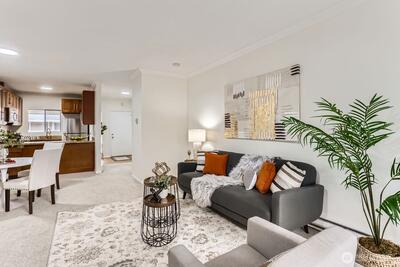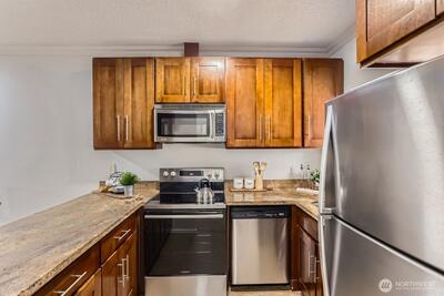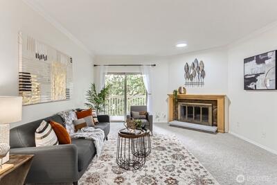 Ton of natural light in this top floor unit with new fresh interior paint, high ceilings. Enjoy brand new carpet, new cooking range, new high end lighting fixtures. Chef's kitchen with ample of storage, newer SS appliances, granite countertops. Large living room with cozy wood fireplace is brightened by generous sunlight. Two oversized bedrooms with big closets and built-in storage. Private balcony, Elevator access, well maintained HOA. Water, sewer, trash included in HOA dues. Laundry inside unit. Large and secured storage room next to reserved car parking. Minutes from Microsoft, train and 520. No rental cap, no special assessment. Move in ready home great for primary living or investment purchase! Remodeled, spacious unit at great price!