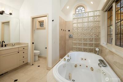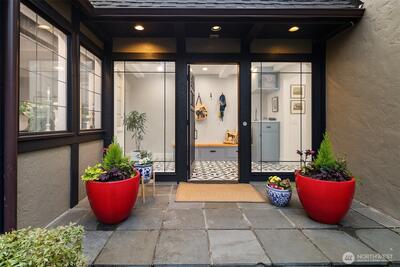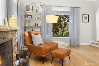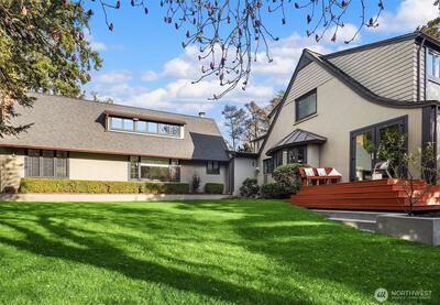 Impeccable detail blending old-world charm and modern amenities in this sprawling Tudor on a lush and private double-lot in Laurelhurst. The home harkens to a San Marino setting with enviable width, custom spaces to entertain, and serenity at every turn. The main level welcomes you and your guests with a warm embrace highlighted by a chef's kitchen with pantry, gracious settee, and dining room peering through matched leaded glass into the beautifully manicured gardens, patios, and sweeping west-side lawn. The main level continues to pleasantly surprise with a sunken living room, cheerful and spacious office, powder room, and sun-drenched hallway leading to a primary suite and spa bath. The upper level on the south wing features three more gracious bedrooms, two baths, and an upstairs office or nursery. The north wing upper level rec. room/gym is magazine-worthy and highlighted by spans of leaded glass windows. The lower level offers another finished space for versatility, laundry, wine