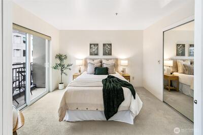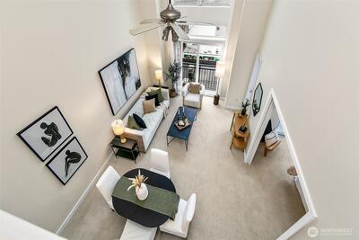Striking 2-story penthouse in the heart of Belltown with dramatic 16-foot ceilings and wall of windows framing city and water views. This bright, modern home showcases concrete countertops, an open-concept living and dining area, and a flexible floorplan ideal for a variety of lifestyles. The spacious primary suite easily accommodates a king-sized bed and has a walk-in closet w/custom built-ins. 2 bedrooms plus dedicated office space give versatility for full-time living or investment. Located just steps from the vibrant new Waterfront Park, world-class dining, shopping, and entertainment. Amenities include 2 rooftop decks, pool, spa, gym, concierge & more. Rare ability to Airbnb makes this an exceptional opportunity for owners & investors.