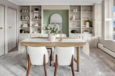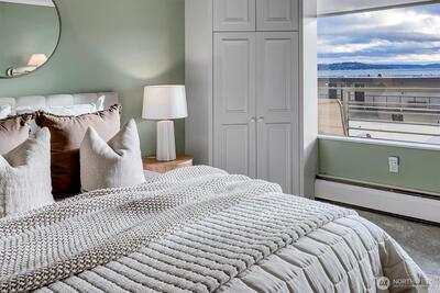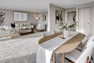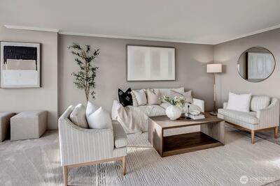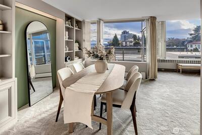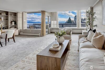 Seldom available, this elegant light and spacious one bedroom plus den waterfront condominium has an impressive view south towards Mt. Rainier. In a security building this immaculate newly painted and newly carpeted property also has a large outdoor covered deck perfect for indoor and outdoor entertaining. In move in condition, here you enjoy a prime location within walking distance to Madison Park dining and shopping. Truly a great lifestyle!