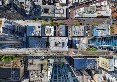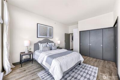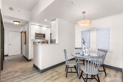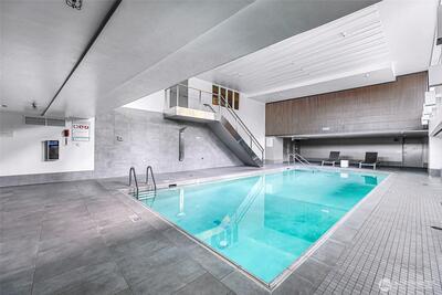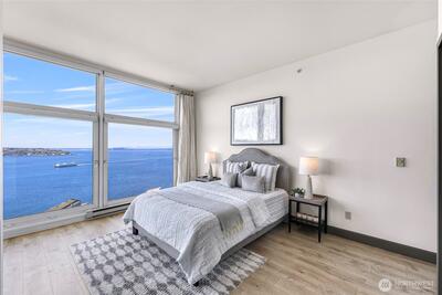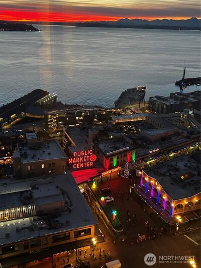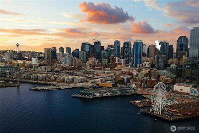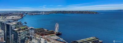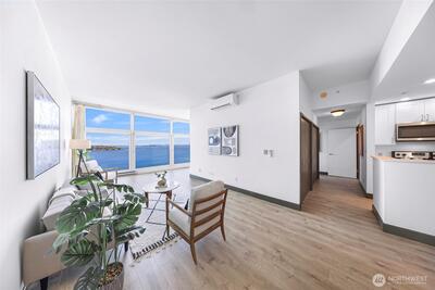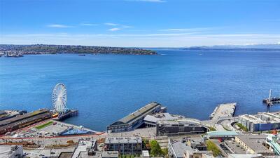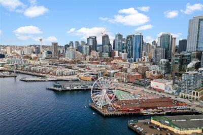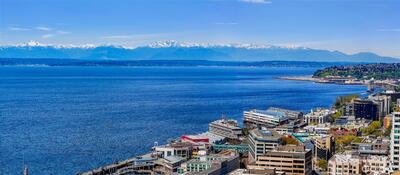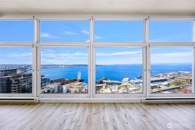 Live in the skies of Seattle: Step into this light-filled, top-floor condo & you'll be captivated by breathtaking, unobstructed west-facing views of the Puget Sound, Olympic Mountains, & sparkling waterfront—truly the best views in all of Seattle. Inside you'll find soaring ceilings, new flooring & paint, a spacious open-concept layout, & a stylishly updated kitchen w/ quartz counters & SS appliances, PLUS AC! The bedroom offers panoramic views & dual closets W/system. In-unit washer/dryer, solar shades, secure parking w/EV charging potential & storage. Amenities: 24-hour concierge, pool, hot tub, sauna, gym, view deck, guest suite, Airbnbs Allowed. Steps to Pike Place Market, light rail, Benaroya Hall, Showbox, & top restaurants & more!