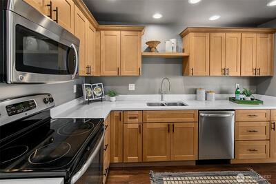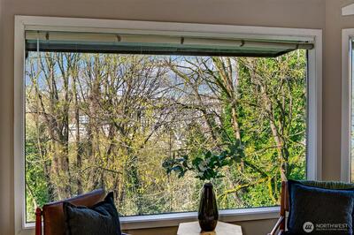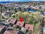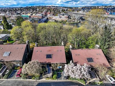 Enjoy ultimate privacy looking out big windows to trees, Fremont, and Lake Union. Top floor 2 level condo is not your basic condo with vaulted ceilings and huge windows. Brand new kitchen (in 2025!) with hardwoods, formal dining space, a private deck, and large living room featuring a fireplace and walls of windows. 3 bedrooms; two on the main floor with a full bath and a high ceiling loft style primary bedroom with ensuite bath and huge walk-in closet upstairs. New carpet and fresh paint throughout. Plenty of storage, including a large room laundry room and extra closet space. Garage parking included plus additional guest parking available. HOA includes utilities, high speed internet, Insurance, Grounds and Exterior maintenance.
