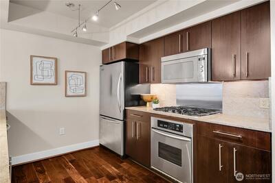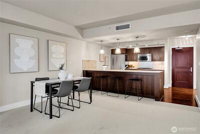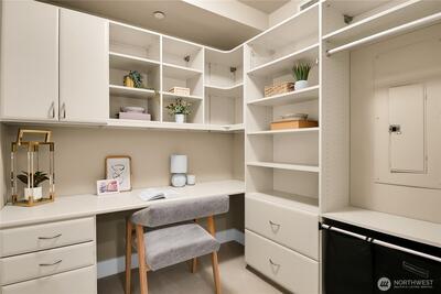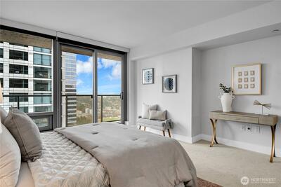 Luxury Downtown Bellevue Highrise in the center of Downtown Bellevue. ONE LINCOLN TOWER is known for placing the utmost importance on safety and security and residents enjoy professional and dependable concierge services. Condo #2103 is extra large at 1,024 square feet (most OLT 1 bedrooms are 757 sf) + condo #2103 has an OFFICE which has been updated with incredible built-ins. Brand new carpeting Dec 2025. The deck is extra long with a sunny southern exposure + great views of Lake Washington! SECURE PARKING GARAGE SPACE C68 on P3. BIG STORAGE UNIT 119 on P4. 4th floor full-size heated swimming pool, relaxing hot tub and a luxury gym. An easy walk to the best shopping, restaurants and bars + multiple transportation options within steps.