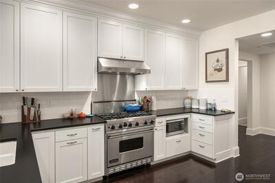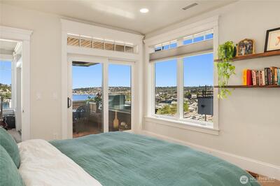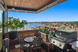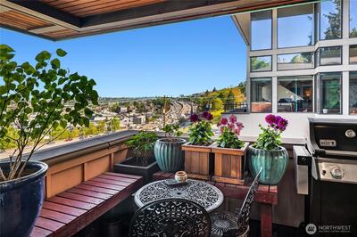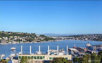 VIEW! LOCATION! SPACE! PARKING! Quiet inside! Spectacular Lake Union views, fabulous sunsets from this west-facing luxury condo. Boutique building, w/only 6 units, each has a private elevator entrance. Open gourmet kitchen w/granite counters & Viking gas range! Hardwood floors dress up the space & walls of windows overlooking Lake Union & Gasworks Park. Living room w/fireplace, 2nd bedroom w/its own bath for guests or office! Owner's suite with a marble-clad bathroom and multiple closets/built-ins. Covered private patio to BBQ & enjoy lake views. Tandem garage parking for 2, powder room, in-unit laundry, shared roof-top deck. Secure lobby entrance, secure garage parking. Very well insulated from the road, QUIET inside.