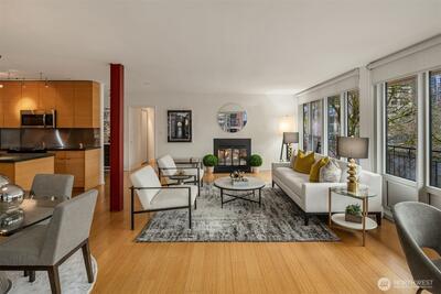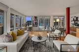 Exquisite mid-century penthouse condo in one of city’s most historic buildings. Expansive windows frame captivating views of skyline. Design elements offer sophisticated urban living with period touches. Open design layout ensures a seamless flow of space while maximizing natural light. Bamboo hardwoods + stylish fireplace add character. Totally rejuvenated kitchen sets stage for culinary excellence with newer stainless appliances, quartz counters + custom cabinets. Laundry area with pantry storage + wine fridge. Expand entertainment options with large, enclosed sunroom + wraparound deck. Primary bedroom has ensuite, walk-in closet + deck access. Parking + easy access to downtown, Cap Hill.