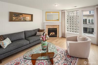 Experience luxury living at the Brezza, in the heart of Downtown Kirkland This amazing location places you within walking distance of shops, restaurants, Marina Park,+ Kirkland Urban space, provides easy access to I-405 & major tech hubs. Open floor plan two-bedroom, one level 1,440 sq feet, 2 baths, gourmet kitchen w/stainless steel appliances-including wolf range, breakfast bar, dining area, new engineered wood wide plank flooring, spa inspired primary bath, gas fireplace, central A/C , HVAC w/Air Scrubber/Purification,2 parking+2 storage & new paint in entire unit including kitchen cabinets. Amenities include 2 guest suites, on-site manager, community room w/ kitchen, conference room, courtyard, bike & kayak storage, guest parking+ gym.