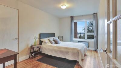 Fully furnished, spacious 1BR/1BA condo in Seattle’s Park Terrace, ideally located in Queen Anne. Updates throughout. Kinnear Park across the street with Puget Sound views beyond. Mid-Century character, gorgeous oak floors, large, updated picture windows (watch the ferries sail by), great kitchen with lots of quality cabinetry, dedicated dining area, rooftop deck (sweeping views), extra storage, bike parking. Pet-friendly, no rental cap. Easy transit; Zone 13 street parking + EV spots out front.