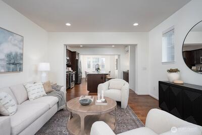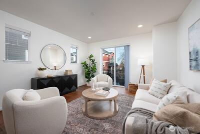 Discover this impeccably remodeled, light-filled end townhouse in the vibrant heart of West Seattle combining expansive interior living with rapid access to Downtown. Remodeled with designer-selected finishes; new carpet, lighting, fixtures, paint throughout. Soaring ceilings and walls of windows. Huge 2-car garage with extra storage, Fenced yard! Giant Kitchen, complete with premium quartz countertops, custom cabinetry, high-end stainless steel appliances. Luxurious Primary Suite: vaulted ceilings, a walk-in closet, and a spa-inspired bathroom with a dual vanity and large walk-in shower. Sustainable Living with energy-efficient systems, including mini-split heating/cooling and smart-home integration. Well run community of great neighbors!