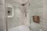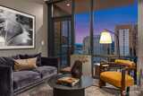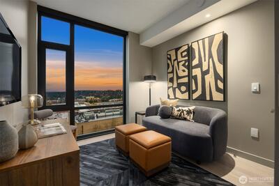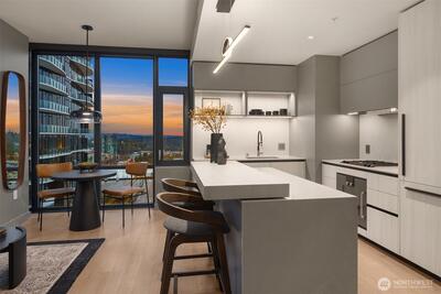 Experience the first in Avenue Bellevue’s Crafted Home Series. This two-bedroom is inspired by the espresso martini—dark, moody, and timeless with smooth richness. Drawing from the Avenue Roastery cocktail by InterContinental mixologist Maria Yoshimizu, designer Tara Nelson created a home with bold yet relatable appeal. The entry features black-and-tan geometric wallpaper and sculptural lighting for a lounge-like first impression. Expansive windows balance the dark palette with natural light. A second bedroom doubles as a refined home office, while the primary bedroom layers textiles and tonal depth for a hotel-worthy retreat. Finished with signature Avenue Bellevue kitchens and baths. Fully furnished and available to tour.