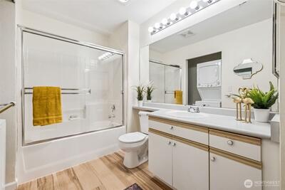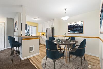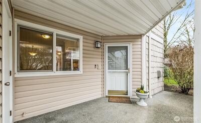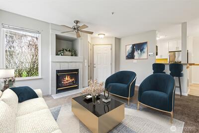 Windsong Arbor Condominium on Kent East Hill! Move-In Ready ground floor End Unit, all 1-story with 1 bdrm & 1 Full Bath in a gated community. Enjoy the spacious living room with LOTS of windows for light and a cozy gas fireplace. The kitchen is beautifully updated with white cabinetry, soft close & pull-out shelving for easy access, quartz counters & newer flooring. All appliances stay (incl washer & dryer). The oversized bedroom has 2 spacious closets. Full bath has new flooring. Parking includes an assigned carport plus an uncovered space for a 2nd vehicle. Handy exterior storage off a sweet front porch. Enjoy community amenities, incl. clubhouse with exercise room, gathering area, sports courts & pet Park. Location, location...all in great proximity to shopping, restaurants & freeways. Owner will pay amount of 3 mos HOA dues for Buyer and Seller's HOA Special Assessment Balance at Closing. Must See! (Living, Dining & Bedroom Virtually Staged).