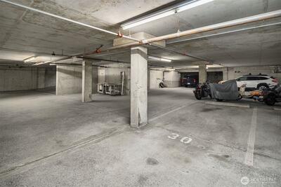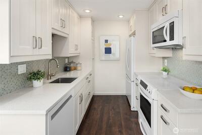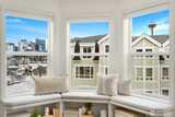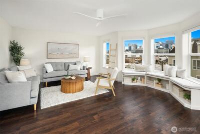 Spectacular, light-filled corner unit with sweeping downtown views in vibrant Lower Queen Anne. Large south-facing windows provide abundant natural light. Features two spacious bedrooms; the primary includes an ensuite bath and built-in closets. Both bathrooms have been tastefully updated. Enjoy heated floors throughout, new Low-E glass, and a full-size washer/dryer. Includes two secure parking spaces, bike storage, and a private storage unit. Steps to cafes, restaurants, grocery stores, Seattle Center, and Lake Union. Close to SLU and offices for Amazon, Google & Meta. Well-funded HOA.