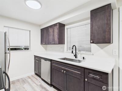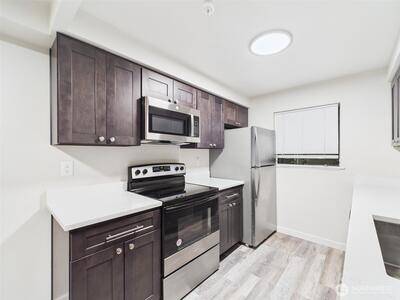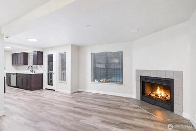 Beautifully remodeled 3 bed 2 bath condo showcasing sweeping views of Puget Sound and the Olympic Mountains. The spacious living room offers a cozy wood-burning fireplace and a picture window framing stunning water views, flowing seamlessly into the updated kitchen with soft-close cabinetry, stainless steel appliances, and quartz countertops. The primary suite includes an updated full bath for added comfort and privacy. Enjoy breathtaking sunsets from the expansive west-facing balcony deck. Additional features include a private storage shed and two-car two-car tandem parking. Ideally located just minutes from Redondo Beach and boardwalk, approx 15 minutes to Sea-Tac, with easy access to bus lines, shopping, dining and more.