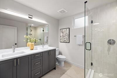 High-quality new construction by Brikat Homes blends modern elegance with everyday convenience. This thoughtfully designed home offers two bedrooms plus a versatile third bedroom/media room and two baths. The designer-curated interior features high-end appliances, quartz countertops, and custom Abodian cabinetry, with an open main-level layout ideal for dining and living, complete with full bath. Upstairs, the elegant primary suite includes a spa-like bathroom and second bedroom. The lower level features a spacious office/flex room or third bedroom with double doors opening to a patio and fully fenced yard. EV-ready one-car garage.