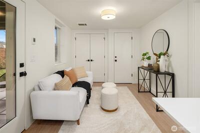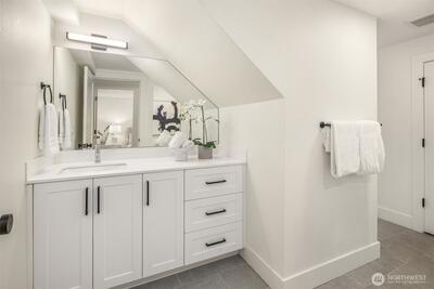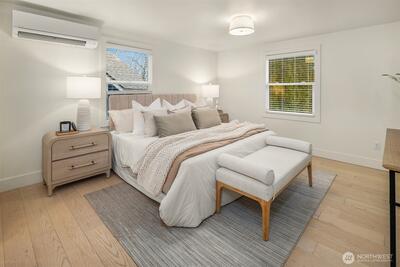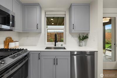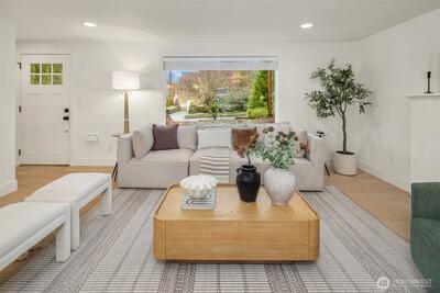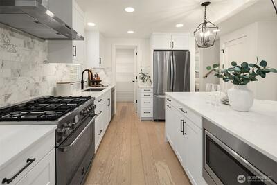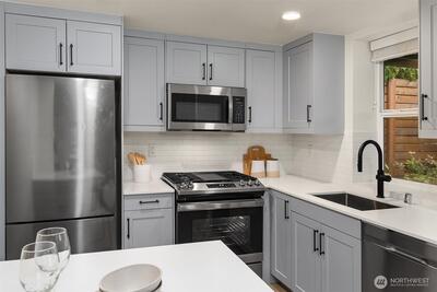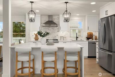 Amazing opportunity to live in one of Ballard’s most sought-after neighborhoods. This beautifully remodeled 1940s home blends modern design with timeless old-world charm. The open-concept kitchen and living area flow seamlessly to the back deck, creating an ideal setting for entertaining and indoor-outdoor living. The main level features a spacious primary suite, while the upper level offers two additional bedrooms. The lower level includes a private suite with an additional bedroom, bathroom, and kitchen—perfect for rental income, a home office, or guest accommodations. Enjoy peekaboo views of the Ship Canal Bridge and stunning sunset vistas. This studs-down remodel was executed by esteemed local design-build experts at Gerry Homes.