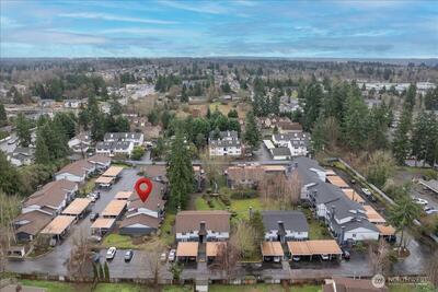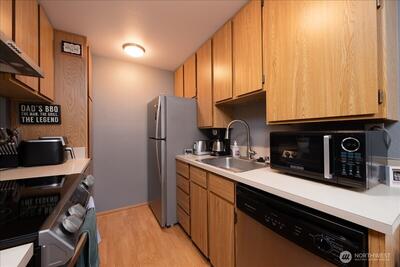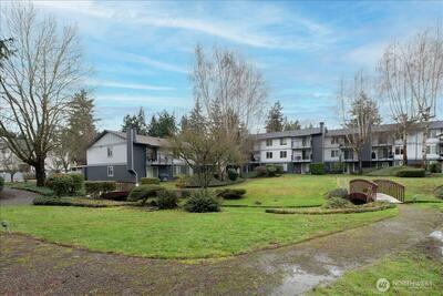Perched on the top floor of Twin Firs in Kent, this move-in-ready two bedroom condo is a rare find. Updated interiors pair with a cozy wood stove and in-unit laundry for everyday comfort. Large living space flows into dining room and open galley kitchen. Spacious bedrooms with a semi-en-suite off the primary, plus plenty of closet storage throughout. Step onto your private balcony overlooking the serene inner courtyard—lush trees, a meandering creek, and charming bridges create a peaceful, park-like setting. Centrally located yet tucked away, this secure, gated community offers dedicated covered parking, tons of guest parking, and a huge storage unit. Well managed HOA with no special assessments. A truly special home that blends convenience with tranquility.
