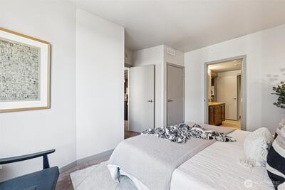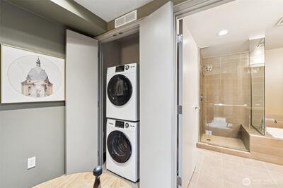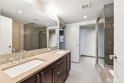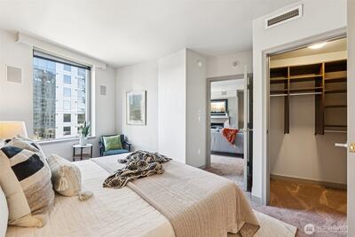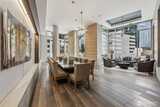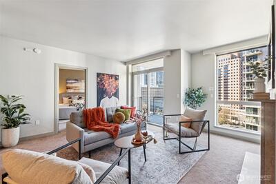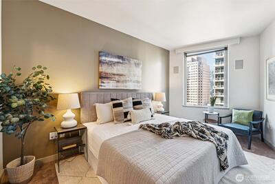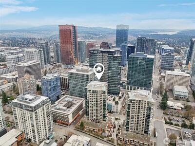 Live at the center of it all in this beautifully upgraded Downtown Bellevue residence, offering refined finishes & effortless urban comfort. A bright, open layout showcases quartz countertops & backsplash, refinished premium cabinetry & a quartz-appointed primary bath. Natural light fills the spacious living room & flows seamlessly to a sunlit patio. West facing unit has sunlight all day long! Automated shades & upgraded surround sound, while concrete & steel construction provide lasting quality. Enjoy dedicated parking, generous storage & building amenities including 24-hour concierge service, fully equipped gym, spa, locker rooms, and lounge. Perfectly positioned just moments from shopping, dining, Amazon, and the waterfront, this home delivers elevated city living at its finest. No pillars inside unit.