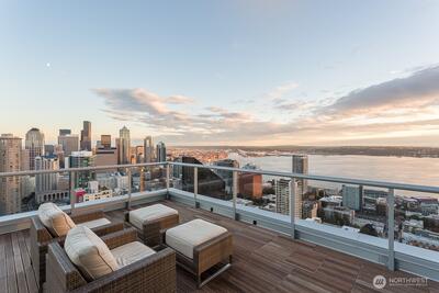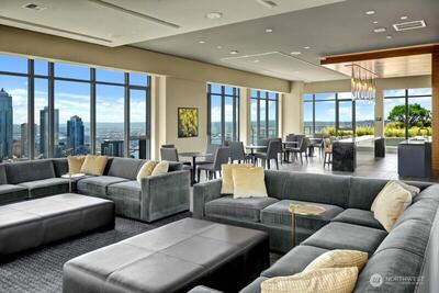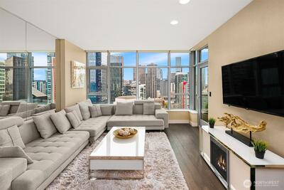Perched high on the 24th floor of the coveted Insignia, this southwest-facing residence showcases unobstructed views of the city skyline and Puget Sound. Impeccably maintained and thoughtfully upgraded with custom wall coverings, built-ins, and closet systems. Enjoy central A/C, secure garage parking, and additional storage. World-class amenities include a two-level fitness center with yoga and Pilates studios, indoor pool, hot tub/sauna, pet spa, open-air park, rooftop Sky Lounges, and 24-hour concierge. Steps to Amazon, Pike Place Market, and Whole Foods.