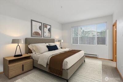 Hard-to-find 3-bedroom, 2-bath ground-level end unit with no rental cap and a private fenced backyard—perfect for homeowners and investors alike. This 1,346 sq ft home offers true no-step living and a desirable open floor plan. The kitchen features a convenient countertop bar and flows seamlessly into the dining and living areas, making it ideal for everyday living and entertaining. The living room is anchored by a cozy gas fireplace and opens to a private patio and fenced yard—great for pets, gardening, or relaxing outdoors. The spacious primary suite includes a large walk-in closet and an en-suite bath with dual vanities. Two additional bedrooms provide flexibility for guests, a home office, or hobby space. Enjoy the convenience of an in-unit washer and dryer, a 1-car garage with shelving, plus an additional dedicated parking space. Ideally located near shopping, restaurants, parks, waterfront access, and the Burke-Gilman Trail. Photos are virtually staged to showcase the home’
