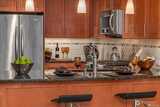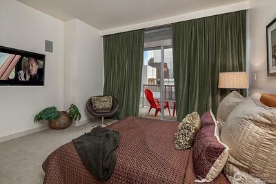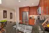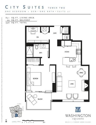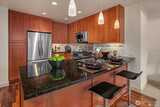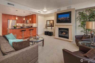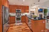 Luxury, security & convenience awaits in this 1 bdrm + den home, sculpted to blend form & function! Modern unit features stylish kitchen w/slab granite counters, breakfast bar & SS appliances. Gleaming hdwds & new carpet throughout. Living room w/flat screen TV, gas fireplace & built-in speakers for surround sound. Large 95 sf deck is accessible from both the living rm & bdrm. Amenities include owner's lounge, gym, spa, yoga studio & 24hr concierge. Walk to restaurants, shopping & nightlife.
